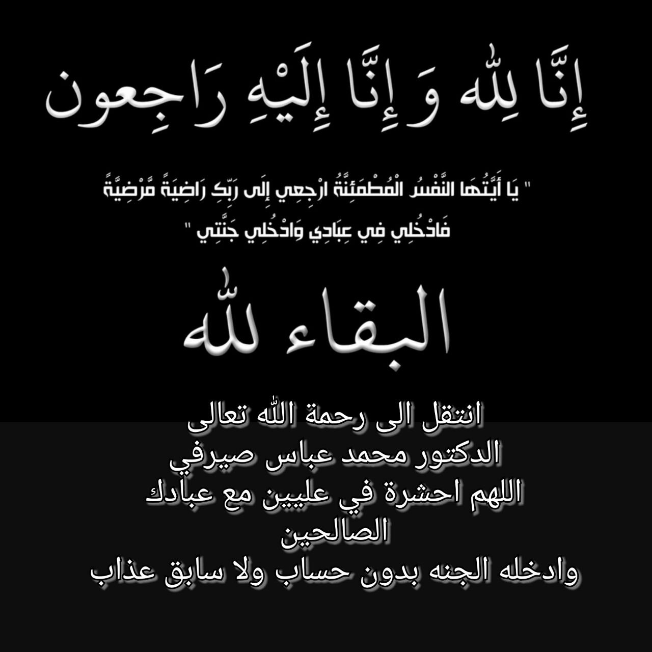 يا أهل الفقيد إن لله ما أخذ وله ما أعطى وكل شيئ عنده بأجل مسمى فلتصبروا ولتحتسبوا عظم الله أجركم وأحسن الله عزائكم وغفر الله لميتكم وأسكنه فسيح جناته وجميع أموات المسلمين ورزقكم الله الصبر والرضا.