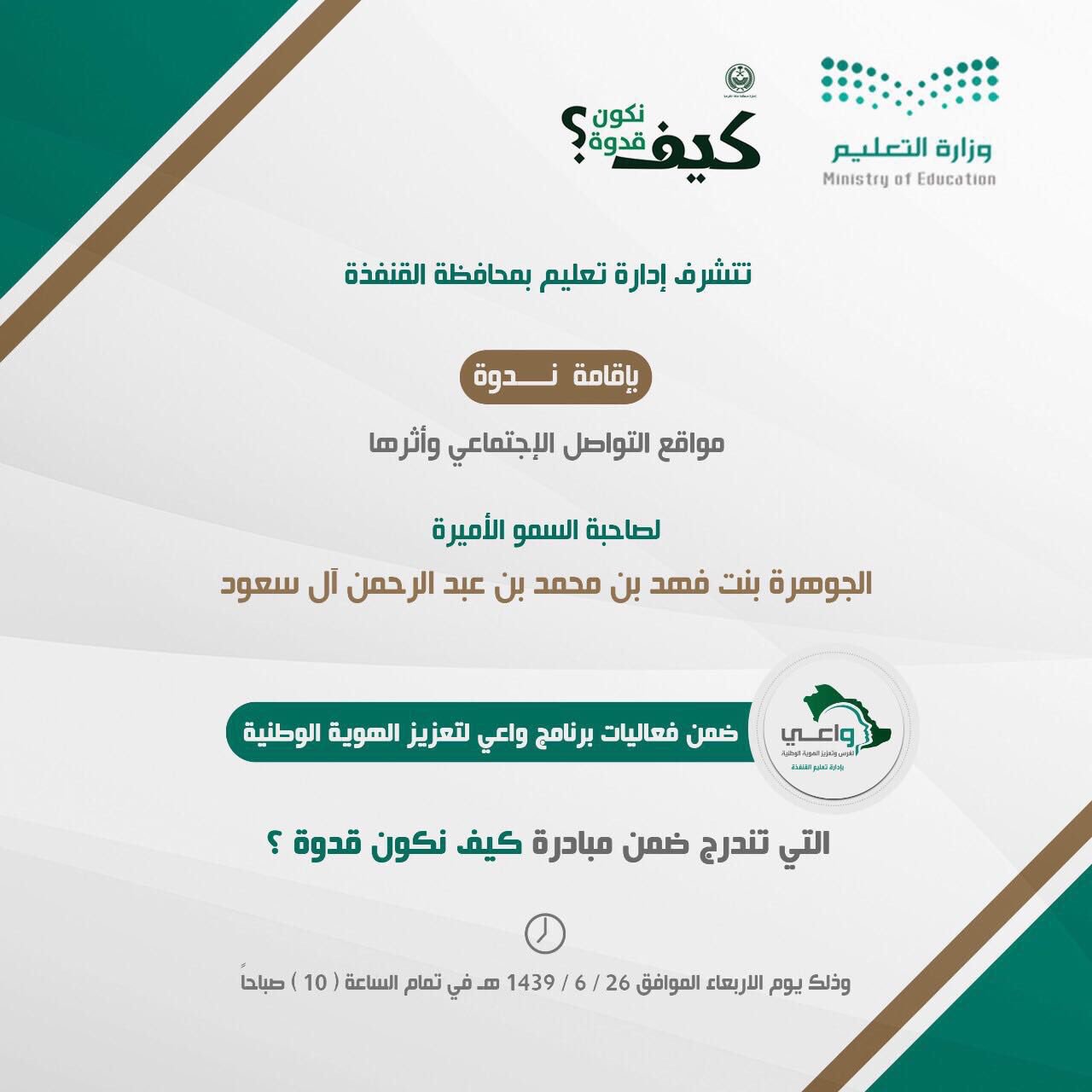 ملتقى مكة الثقافي V Twitter إدارة تعليم القنفذة تقيم ندوة بعنوان مواقع التواصل الاجتماعي وأثرها تلقيها صاحبة السمو الأميرة الجوهرة بنت فهد آل سعود ضمن مبادرة واعي Qudwa1439 إحدى مبادرات ملتقى